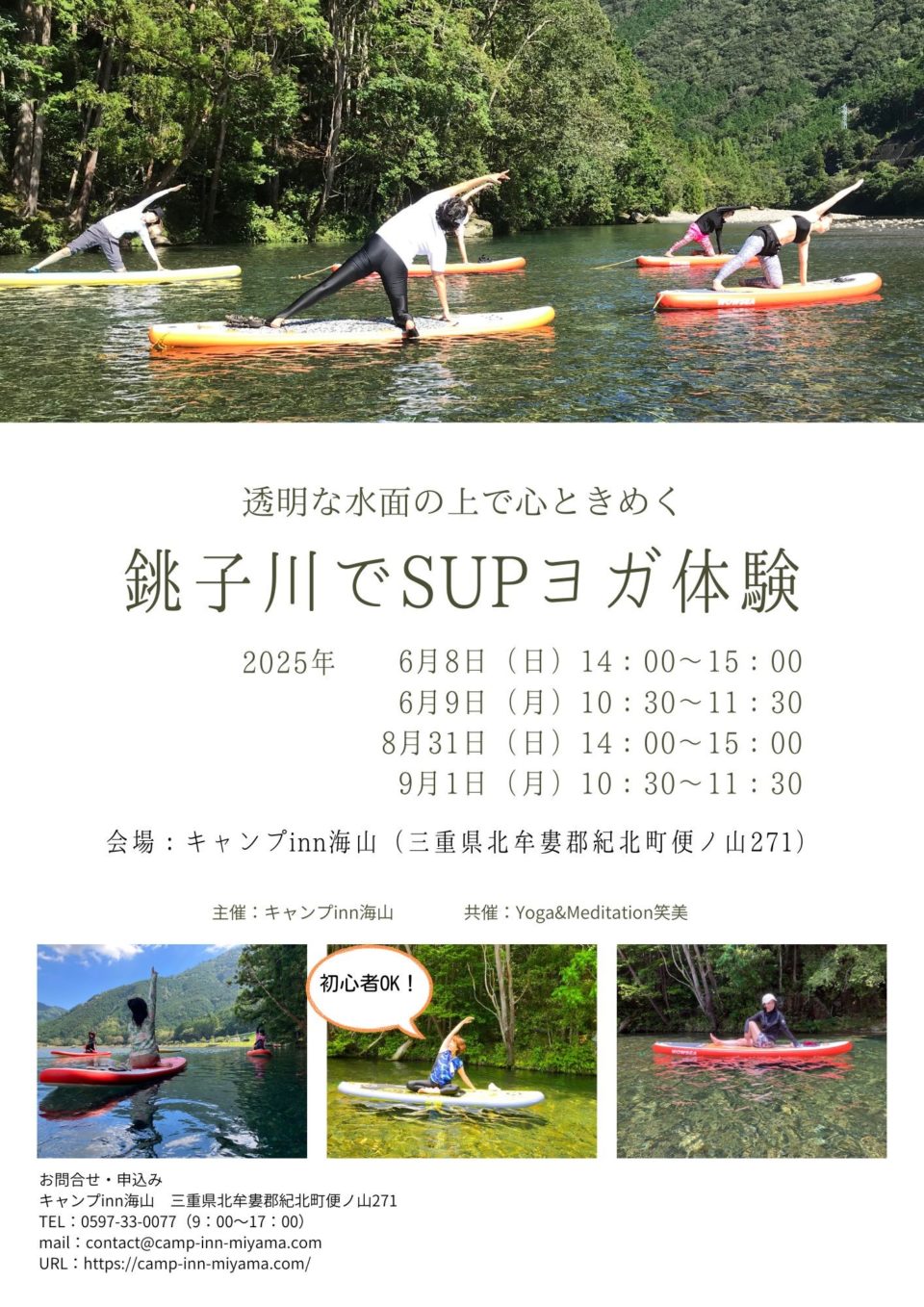 日本有数の透明度を誇る銚子川でのSUPヨガ体験! ボードの上でのヨガはユラユラと不安定でドボーン! と落ちる事もありますが、銚子川の美しさを満喫しながら、ヨガでリフレッシュしよう! ヨガ・SUPが初めてでもご参加いただけます! 雨天時、増水時は屋根がある会場でSUPを利用しヨガを行います♪ 雨音をBGMにメディテーションSUPヨガ(エアーSUP)をお楽しみください。 講師は、ヨガインスタラクター・メディテーション講師でもある『Yoga &Meditation笑美』の大川由美子さん。 詳細は下記をご覧いただき、ご予約をお願いします。 -----------------------------+ 📍日時 6月8日(日)14:00~15:00 6月9日(月)10:30~11:30 8月31日(日)14:00~15:00 9月1日(月)10:30~11:30 📍場所 受付:キャンプinn海山センターハウス(体験時間30分前~) 体験:銚子川えん堤上(キャンプinn海山上流部:徒歩3分) 📍料金 4,000円(一般) 3,500円(紀北町民・キャンプinn海山宿泊者) ※SUP持込の場合は1,000円割引 📍対象 中学生以上 📍定員 各回7名(先着順) 📍持ち物 アクアシューズ、タオル、水着着用、濡れても良い服装、飲み物、(サングラス、帽子)等 📍備考 ・受付は30分前~センターハウスにて ・前日、当日のキャンセルは30%申し受けます ・体験に参加されない方がキャンプ場でお過ごしの際は、別途利用料が必要です ・雨天は別プログラムにて開催 📍申込・問い合わせ キャンプinn海山 TEL:0597-33-0077(9:00~17:00) 主催:キャンプinn海山 共催:Yoga &Meditation笑美 -----------------------------+