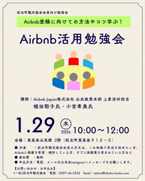 紀北町で民泊を始めたい方、Airbnbの登録にご興味がある方を対象とした勉強会です。