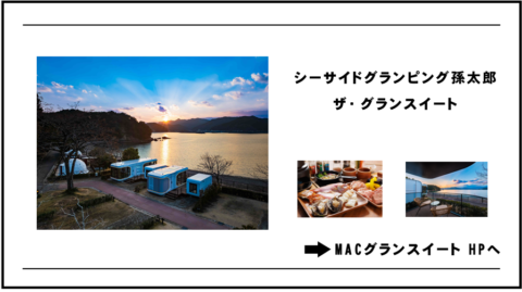 2026年3月、「シーサイドグランピング孫太郎 ザ・グランスイート」がオープンしました。海越しに山々を眺められる、まさに特等席。まるでホテルの1室のような高級感を味わいながら、紀北町の大自然を堪能できます。